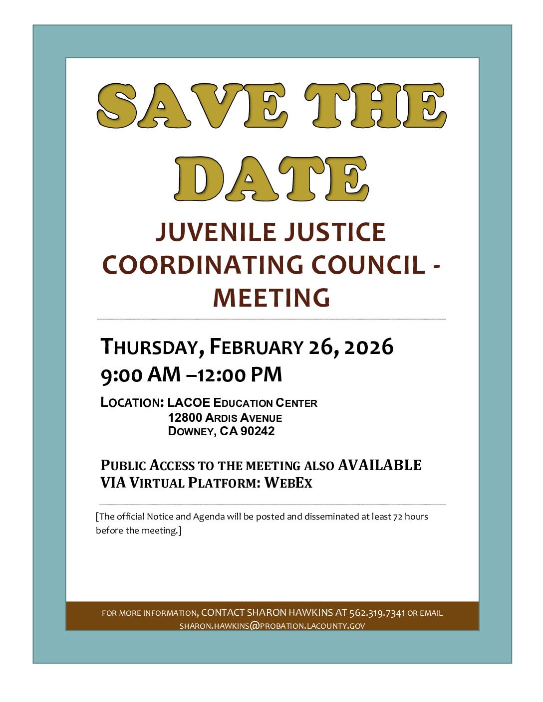 The JJCC August 6, 2020 JJCC Meeting is being postponed in accordance with Governor Newsom’s Executive Order N-25-20, directing Californians to follow public health directives, and consistent with the California Department of Public Health’s guidelines on gatherings.
